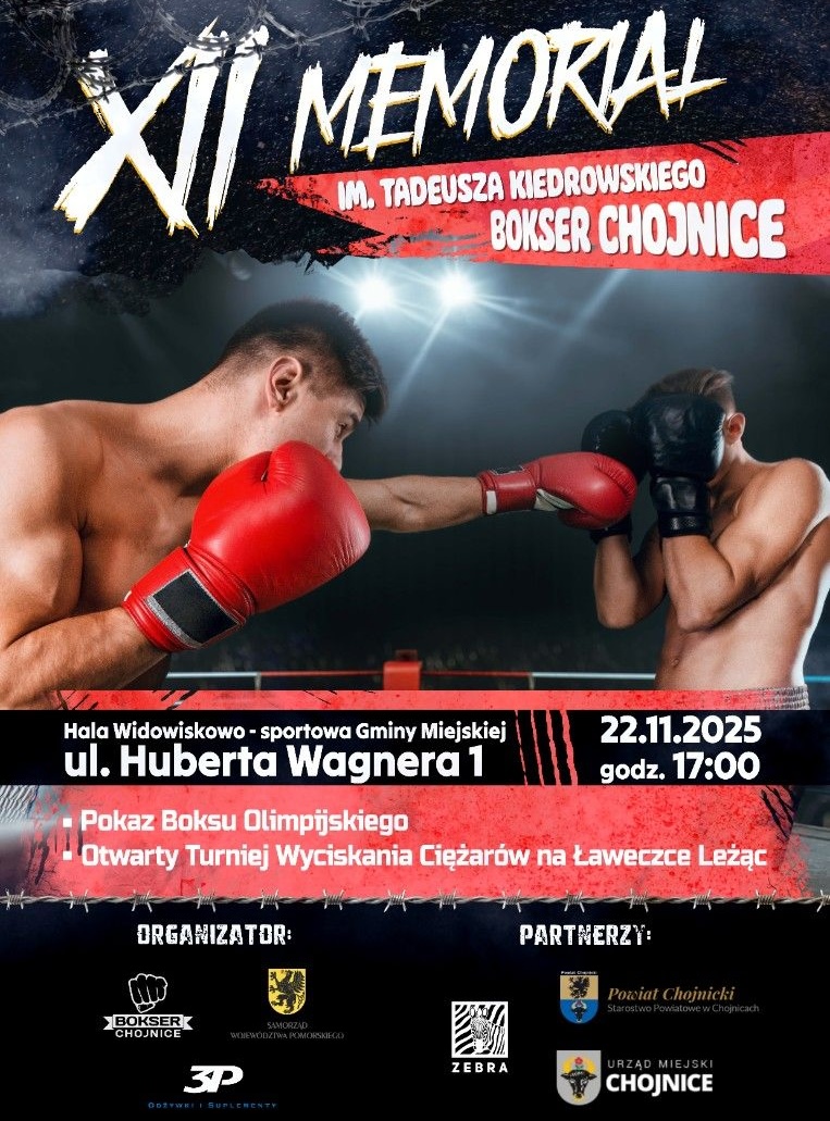 Przed nami kolejna, dwunasta edycja Bokserskiego Memoriału imienia Tadeusza Kiedrowskiego – wydarzenia, które na stałe wpisało się w kalendarz sportowych imprez w Chojnicach. Tegoroczna odsłona odbędzie się 22 listopada o godzinie 17:00 w Hali Widowiskowo–Sportowej w Chojnicach. Organizatorem wydarzenia jest sekcja Bokser Chojnice.